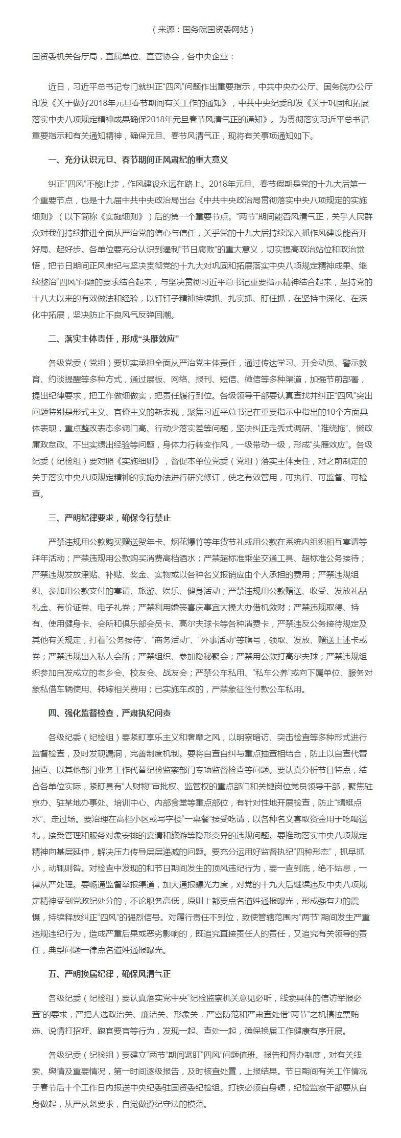 中央紀委駐國資委紀檢組關(guān)于2018年元旦、春節期間鞏固和拓展落實(shí)中央八項規定精神成果的通知